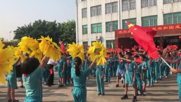 首先,全體學(xué)生站在教室門前齊唱《東方紅》、《閃閃紅星》,接著,全校師生齊聚操場(chǎng),莊嚴(yán)肅穆地參加升國(guó)旗儀式。伴隨著激昂有力的出旗音樂,四位護(hù)旗手護(hù)衛(wèi)著鮮艷的國(guó)旗,步宇軒昂地大步向前走來。鮮艷的五星紅旗徐徐升起,全場(chǎng)的學(xué)生伴隨著樂曲唱起了國(guó)歌,歌聲雖然稚嫩但依然嘹亮,主持人李老師表?yè)P(yáng)了學(xué)生們規(guī)范的升旗禮儀。隨后,陸銳勛校長(zhǎng)進(jìn)行愛國(guó)教育,他說道,新中國(guó)成立以來,中國(guó)走到現(xiàn)在的繁榮富強(qiáng)實(shí)在不易,我們要不忘初心,砥礪前行,好好學(xué)習(xí),長(zhǎng)大報(bào)效祖國(guó)。緊接著,全體師生齊唱《我和我的祖國(guó)》和《歌唱祖國(guó)》,學(xué)生們積極揮動(dòng)著手中的小紅旗,張大嘴巴歌唱,表達(dá)著對(duì)祖國(guó)熱愛以及贊美之情。最后,陸校長(zhǎng)帶領(lǐng)全體師生呼號(hào)“祖國(guó)萬歲!”