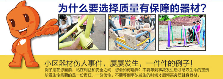 3、第三類是其他無任何活動性零部件的穩(wěn)固性器材。如固定式踏樁、平衡木(實際上是鋼鐵部件)、固定式的階梯、攀巖墻、仰臥起坐床等,由于不存在各部件的磨損、碰撞等現(xiàn)象,在戶外環(huán)境并同樣設(shè)定在基本無人日常管理的使用條件下,自2011年10月1日期實施室外健身器材新**標(biāo)準(zhǔn)所有器材的安全使用年限為8年。