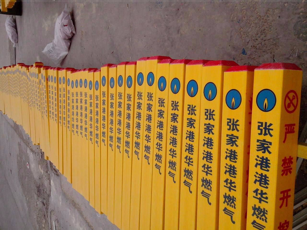 玻璃鋼(PVC)標志樁安裝底部設有兩對穿孔,0.5直徑小斷鋼筋呈十字交叉,灌少量水泥固定;安裝步驟:1.挖30-50cm深度30-60cm方洞2.將兩段鋼筋插入標志樁下方對稱插孔中呈對稱十字交叉3.放入標志樁;燃氣管道警示牌的用途玻璃鋼標志牌常用于高風險地區(qū)管道安全防范事項的地面警示標志,例如隧道、大型河流、山谷、沖溝、村莊等。用于標記埋地管道的轉(zhuǎn)向、管道與地面工程(地下隱蔽物)交叉、管理單位交界、管道結構變化(管徑、壁厚、防護層)、管道附屬設施的地面標記。常見為鬧市、風景區(qū)、綠化帶、灌木叢、頂管兩側(cè)管線路徑指示作用。輸油管道標示牌又叫輸氣管道標示牌、電力電纜標示牌、礦區(qū)指示標示牌、交通警示標示牌、戶外指示牌等。燃氣管道標志牌(管道s環(huán))三要素1、識別s,2、介質(zhì)名稱,3、流向所有管道標識都必須注明識別s、介質(zhì)名稱和流向,這j是管道標識的基本三要素。有些管道還須注明壓力、流速、溫度等,危險化學品管道需要用專用?;穝環(huán),消防管道還要注明消防專用等。