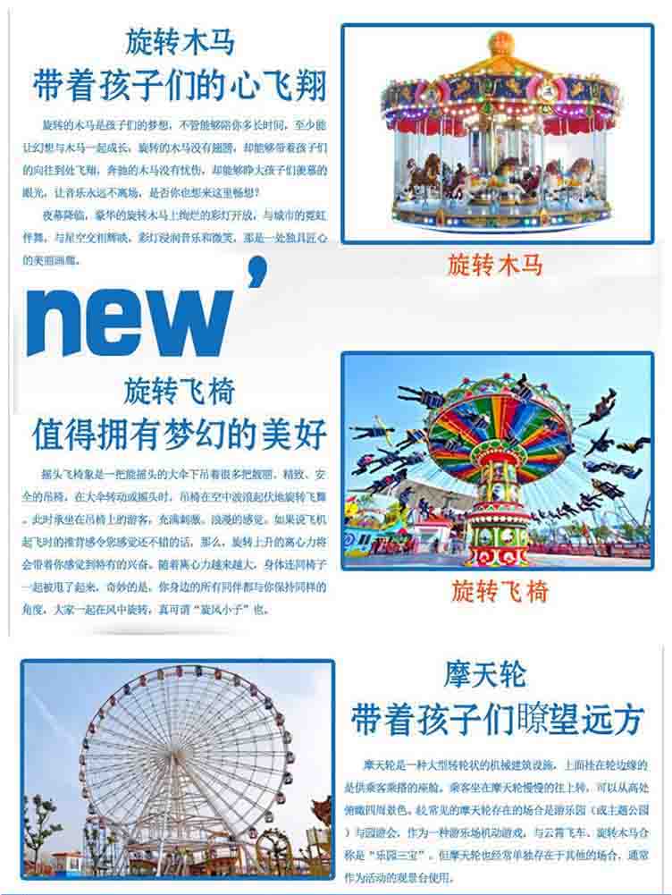 主營產(chǎn)品為:過山車、摩天輪、大型飛椅、轉(zhuǎn)馬、滑車、玻璃吊橋、小火車、大擺錘、玻璃棧道等機械設(shè)備和景區(qū)戶外設(shè)備,我們相信通過我們的不斷努力和追求,一定能實現(xiàn)與客戶的互利共贏。