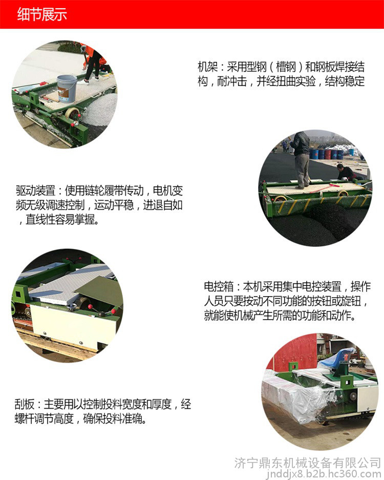 2、驅(qū)動(dòng)裝置:使用鏈輪履帶傳動(dòng),電機(jī)變頻無(wú) 調(diào)速控制,運(yùn)動(dòng)平穩(wěn),進(jìn)退自如,直線性容易掌握。如果需要弧形鋪設(shè),轉(zhuǎn)彎操作有很方便,不受弧形大小的限制。不同底部的基礎(chǔ)均可行走。