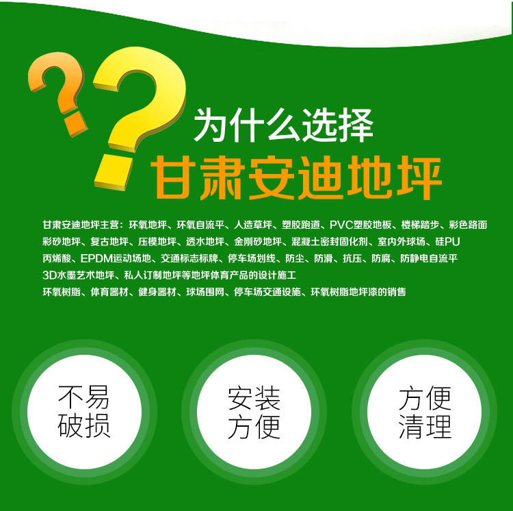 經(jīng)營范圍:環(huán)氧地坪、環(huán)氧自流平、人造草坪、塑膠跑道、PVC塑膠地板、樓梯踏步、彩色路面、彩砂地坪、復(fù)古地坪、壓模地坪、透水地坪、金剛砂地坪、混凝土密封固化劑、室內(nèi)外球場、硅PU、丙烯酸、EPDM運動場地、交通標(biāo)志標(biāo)牌、停車場劃線、防塵、防滑、抗壓、防腐、防靜電自流平、3D水墨藝術(shù)地坪、私人訂制地坪等地坪體育產(chǎn)品的設(shè)計施工;環(huán)氧樹脂、體育器材、健身器材、球場圍網(wǎng)、停車場交通設(shè)施、環(huán)氧樹脂地坪漆的銷售。