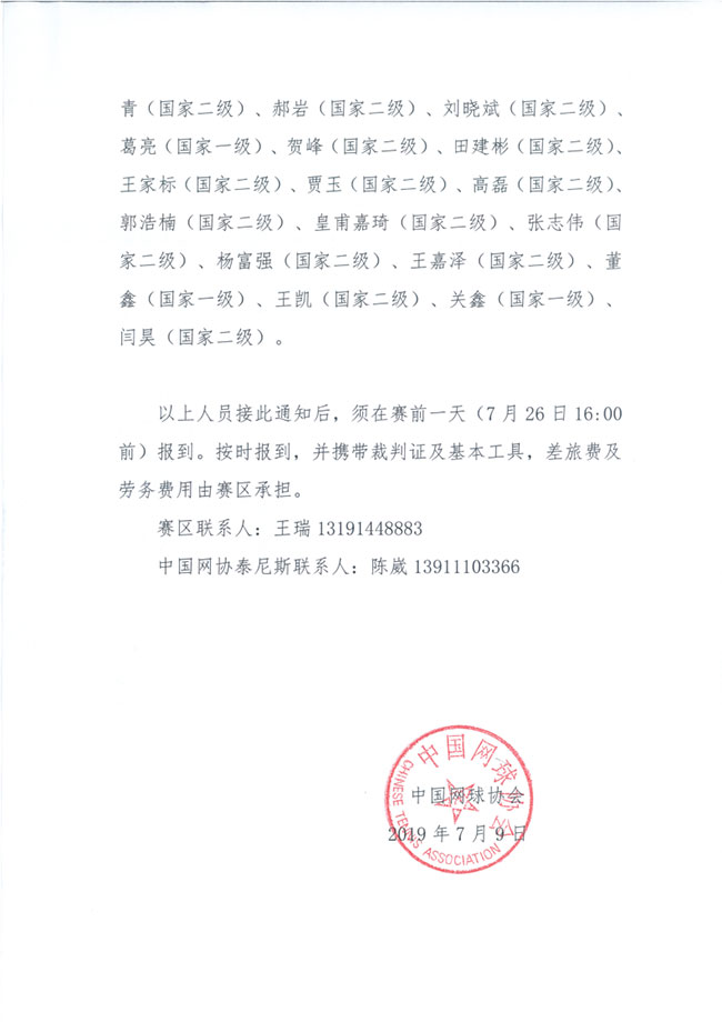 關(guān)于選派2019年中國(guó)業(yè)余網(wǎng)球公開賽日照鉆石賽技術(shù)官員的通知