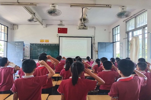 最后,各班孩子都舉起右拳宣誓,大聲喊出誓詞“我是中國人,我是炎黃子孫,龍的傳人,我愛偉大的祖國!我愛偉大,光榮,正確的中國共產(chǎn)黨!我愛勤勞智慧的人民,我愛我的家鄉(xiāng),我愛我的學(xué)校!牢記歷史,振興中華,好好學(xué)習(xí),天天向上。做有理想,有道德,有文化,有紀(jì)律,合格加特長的革命事業(yè)接班人?!蓖ㄟ^鏗鏘有力的吶喊,相信孩子們在今后的學(xué)習(xí)生活中,努力進(jìn)取,長大后成為社會主義的接班人。