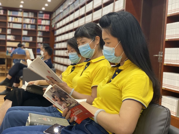 另一隊教師前往中山市紀(jì)念圖書館,在大巴車駛向圖書館的路上,老師們談?wù)撟疃嗟氖菚?,沉浸在閱讀分享中的老師們樂在其中。中山市紀(jì)念圖書館明朗的空間布局、現(xiàn)代化的設(shè)施設(shè)備、豐富的藏書和安靜、濃厚的學(xué)習(xí)氛圍,讓老師們耳目一新。整個下午,老師們都徜徉于浩瀚的書海之中,品味著濃濃書香。