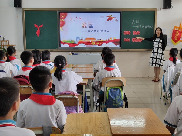 糜秀慧子老師以“做合格的接班人”為題,開(kāi)篇先讓孩子看“江姐”的故事,讓孩子明白先烈們愛(ài)國(guó)的堅(jiān)定信仰。接著觀看新中國(guó)成立70周年取得的偉大成果,學(xué)生討論熱烈,踴躍發(fā)言,紛紛為祖國(guó)的發(fā)展感到自豪。糜老師通過(guò)具體的行為使學(xué)生明白愛(ài)國(guó)的具體做法,最后以重溫入隊(duì)誓詞,歌唱隊(duì)歌兩個(gè)環(huán)節(jié)對(duì)學(xué)生的情感進(jìn)一步地熏陶。