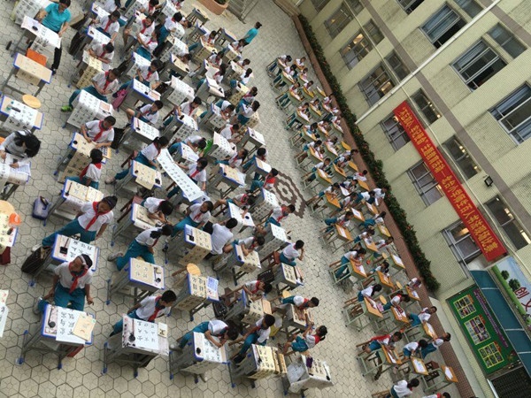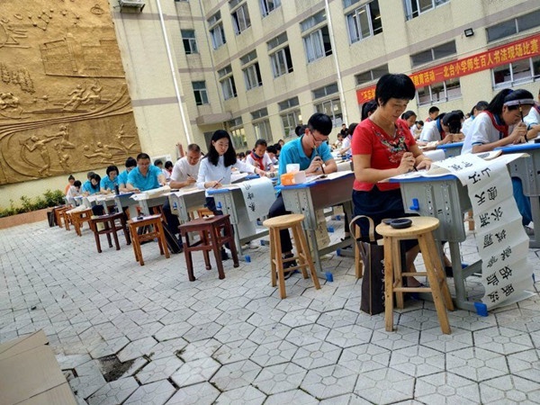 本次活動吸引了許多師生,參與度高,全校師生紛紛踴躍報名。當(dāng)天下午,師生齊聚學(xué)校小廣場,井然有序地擺放桌椅,布置好書法比賽現(xiàn)場。緊接著,報名參加比賽的同學(xué)排著隊(duì),拿好筆墨和毛氈走進(jìn)比賽現(xiàn)場,并快速、有序地按照老師安排的座位坐好。