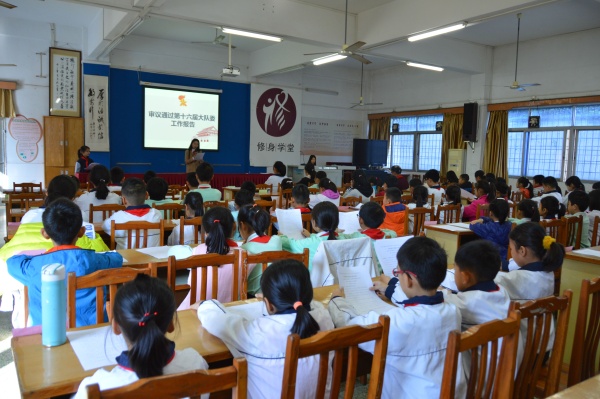 伴隨著莊嚴(yán)的出旗儀式和嘹亮的隊歌,大會拉開了序幕。會上,審議通過少工委第二屆一次全委會選舉辦法、第二屆少工委主任、常務(wù)副主任、副主任候選人名單,并選舉產(chǎn)生了竹秀園中心小學(xué)第二屆少工委主任、常務(wù)副主任。學(xué)校少工委副主任羅少光校長向大會致閉幕詞。他充分肯定了學(xué)校少先隊工作取得的各項成績,希望隊員們樹立遠(yuǎn)大理想,不懈努力,做祖國優(yōu)秀的接班人,整個過程中,代表們認(rèn)真聆聽,積極參與。