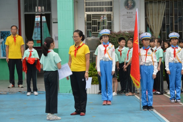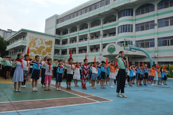 此次活動(dòng)分東西兩個(gè)校區(qū)分別進(jìn)行,西校區(qū)學(xué)生按升旗儀式排好隊(duì),一年級(jí)的預(yù)備隊(duì)員準(zhǔn)備入隊(duì),東校區(qū)各班主任帶領(lǐng)全體少先隊(duì)員面向中隊(duì)旗做到“四個(gè)一”:少先隊(duì)員敬一個(gè)隊(duì)禮、唱一次隊(duì)歌、重溫一次誓詞、莊嚴(yán)呼號(hào)一次。