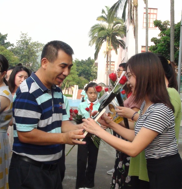 9月9日早上8點(diǎn),全校師生集聚在大操場上,注視著冉冉升起的五星紅旗,高唱《國歌》。接著,兩位少先隊員分別在東西校區(qū)國旗下滿懷深情地進(jìn)行國旗下講話,并代表全體學(xué)生為教師們送上真摯的祝福。緊接著,廣播員邀請所有的老師來到前臺,李向平校長、羅少光副校長和李衍裕副校長分別為東西兩個校區(qū)的老師們送上書本和鮮花,據(jù)悉這是每一年竹小的教師節(jié)最特別的禮物,為每一位老師送上一本老師最愛的書,全校洋溢著陣陣感動和溫情。在洋溢著感恩的氣氛中,李向平校長向全體教職工送上了節(jié)日的祝福,他對一直以來為了學(xué)校的發(fā)展和學(xué)生健康成長辛勤付出的老師們給予了充分的肯定與高度的贊揚(yáng)。