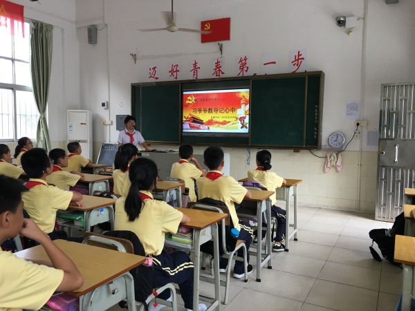 在“習爺爺教導記心中”的主題隊會上,輔導員們向隊員們介紹實現中華民族偉大復興重任,就是實現中華民族近代最偉大的中國夢,這個夢想凝聚和寄托了幾代中國人的夙愿,體現了中華民族和中國人民的整體利益,它是每一個中華兒女的共同期盼。接著,輔導員引導隊員學習習近平總書記的希望和要求,把習總書記治國理政的大道理轉化為隊員們能夠理解的小道理,把習近平總書記工作和成長的點滴轉化為啟發(fā)孩子們心靈的生動小故事。通過一個個生活小故事,孩子們牢記了習近平總書記“從小學習做人、從小學習立志、從小學習創(chuàng)造”的諄諄教導,從小樹立遠大理想,培養(yǎng)良好志向,聽黨的話、跟黨走,努力成長為德智體美全面發(fā)展的社會主義合格建設者和可靠接班人。