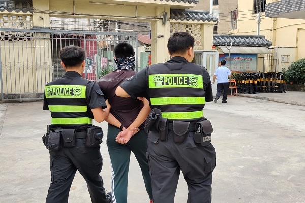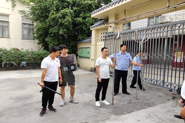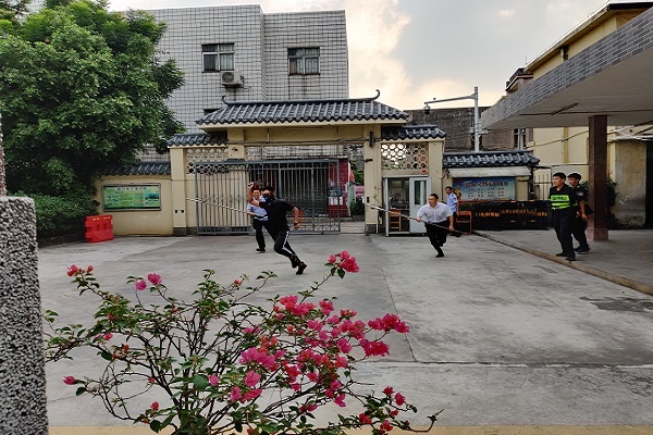 本次模擬場景:清晨,學生上完早讀課后,正三三兩兩地走出課室的時候,一名蒙面的持刀歹徒突然闖進校園。學校立即啟動安全預防校園暴力事件應急預案,廣播員播放警情通知:“有歹徒闖入校園,同學們快速到安全地方!全體老師快速到班級!” 安全組一名老師打電話報警,在學校附近的巡警火速趕到了現(xiàn)場。學校保安室三名保安人員立即持鋼叉和盾牌,老師們則有的持長棍,有的隨手抓起板凳、鐵鍬等工具上前驅(qū)趕,在警察的配合下,大家一起將暴徒制服,最后警察將暴徒緝拿帶走。