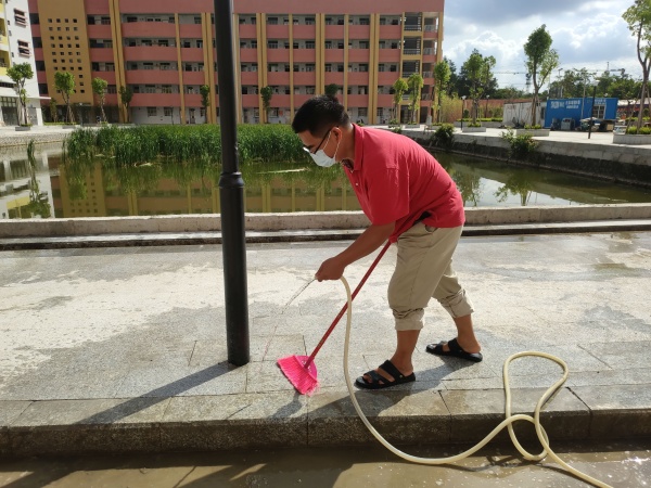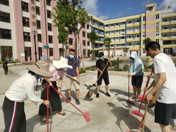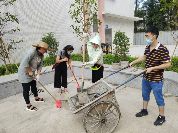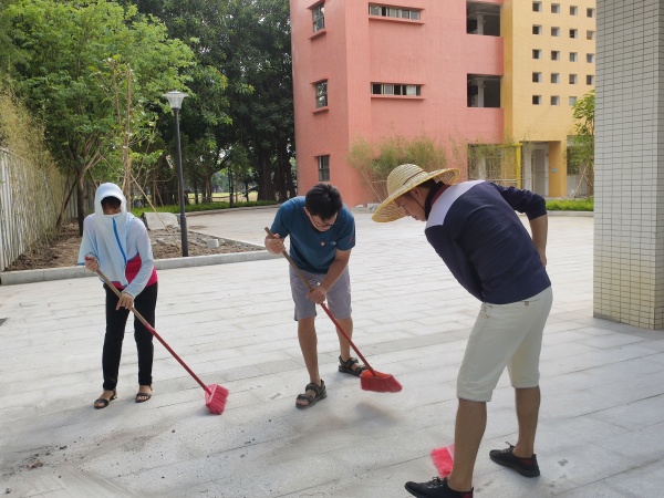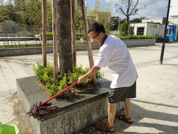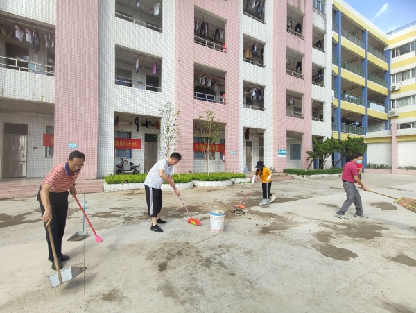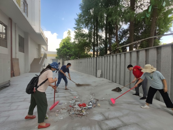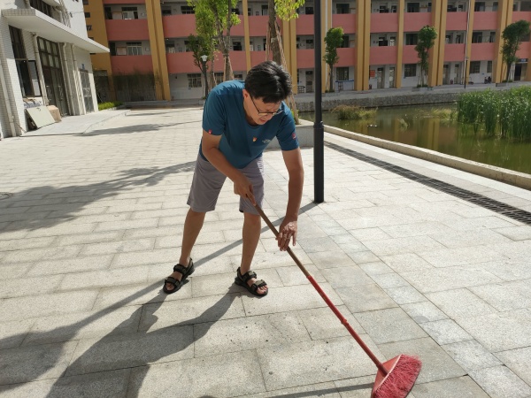 行動(dòng)中,烈日當(dāng)空,炙烤著大地,教師們面對(duì)校園景觀改造工地地面塵土堆積,碎石隨處可見,生活垃圾隱匿角落的景象沒有就此退縮,反而熱情高漲,手拿大掃帚,扛著大鐵鏟,推著斗車,興致勃勃地投入到清潔行動(dòng)中。為了把塵土堆積的地面進(jìn)行徹底地清潔,有的教師拿著水管來沖刷,有的教師拿著拖把來清理;為了把隱匿在空調(diào)主機(jī)背后的生活垃圾,盧新泉校長(zhǎng)用未戴手套的雙手清理垃圾,在盧校長(zhǎng)的率先垂范下,幾位初一級(jí)老師紛紛用手把垃圾清理干凈,充分發(fā)揮了不怕累、不怕臟的精神;他們?nèi)绱苏J(rèn)真地清潔,如此勤懇地付出,是因?yàn)榘褜W(xué)校當(dāng)做家呀!即便是揮汗如雨,依舊義無反顧,教師們的行動(dòng)保證了校園各個(gè)角落干凈整潔。