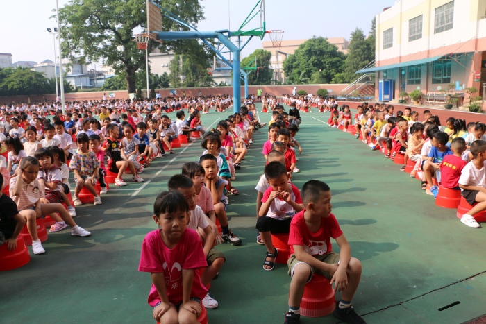 六年級的哥哥姐姐們到達(dá)了一年級新生的課室,將一年級的弟弟妹妹帶到了操場,對甫人用這種特別的方式歡迎今年新入學(xué)的新生們。