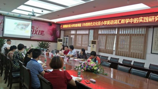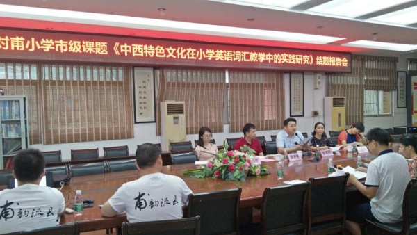 2019年6月27日上午,黃圃鎮(zhèn)對(duì)甫小學(xué)會(huì)議室里進(jìn)行著該校市級(jí)立項(xiàng)課題《中西特色文化在小學(xué)英語詞匯教學(xué)中的實(shí)踐研究》結(jié)題報(bào)告會(huì)。本次邀請(qǐng)了中山市教研室教研員張?zhí)﹦偫蠋?、中山市?shí)驗(yàn)小學(xué)陳玉河老師、南區(qū)竹秀園小學(xué)藍(lán)韶英老師和黃圃鎮(zhèn)教育事務(wù)指導(dǎo)中心袁港喜副主任前來參會(huì)。