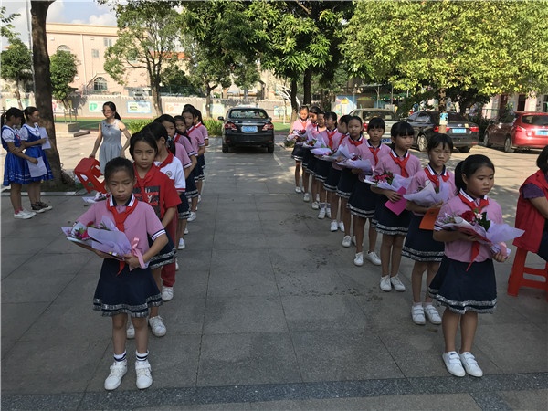 最后是最激動人心的時刻,五年級志愿者們隊列整齊的為每一位老師獻上了一束鮮花和賀卡,每一枝花中都飽含著學生對老師們表達的節(jié)日祝福和深深的敬意。當學生把一張張賀卡和花朵送給老師時,老師們不禁露出了幸福的笑容。