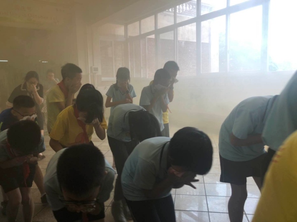 上午8點55分,各樓層突然濃煙滾滾,刺耳的警報聲響徹校園,這是沒有提前通知學生的演練,此時,全校同學們在科任老師的組織下,迅速打濕毛巾,捂住口鼻,彎腰,有序撤離危險區(qū)域,迅速到達操場的安全地帶,所有在辦公室的老師也積極到現(xiàn)場指揮學生疏散,整個活動井然有序。到達操場后,各班班主任和科任老師清點人數(shù),并層層上報,通過兩次的演練,在短短的兩分鐘多鐘,全校師生全部安全疏散完畢。