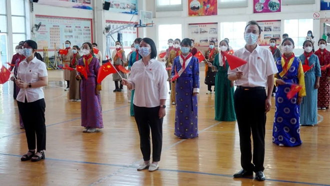 勒流街道黨工委委員江霞,勒流教育辦主任盧綺紅,教育辦黨建人事股股長甘永杰,江義中學(xué)黨總支書記、校長胡和秋,副書記周霞,副校長梁凱奇、段永輝、何善斌,以及西藏部主任鄭林莊等教師,與西藏班學(xué)生一起參加升旗儀式。因疫情仍然留在西藏等候返校的學(xué)生通過網(wǎng)絡(luò)直播參加線上升旗儀式。