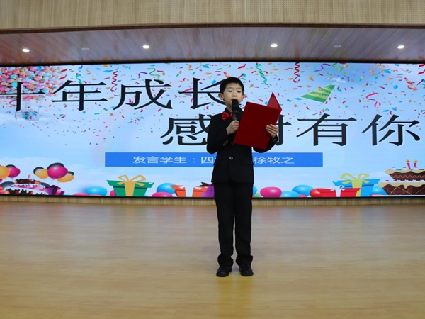 家長代表發(fā)言時,呼吁孩子們,要珍惜幸福的生活,感恩身邊的人!尊敬老師,是作為學生首先要做的事。十歲,是人生的第一個里程。十歲,是全新的起點,十歲,是邁向新臺階的第一步!