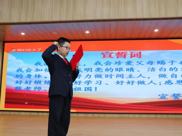 全體四年級孩子們齊唱《一起向未來》,大家在熟悉的旋律中暢想未來,放飛夢想。然后,在主持人的帶領(lǐng)下莊嚴宣誓。高舉的拳頭代表心中的堅定,鏗鏘的誓言飽含對未來的決心。