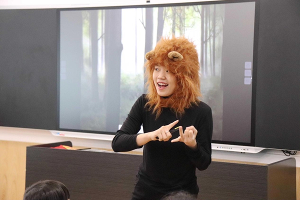 何鳳老師在音樂(lè)室中創(chuàng)設(shè)了一個(gè)森林音樂(lè)課堂的情境,并且扮演森林中獅子角色,讓孩子們驚嘆不已。
