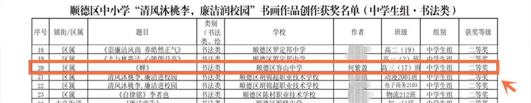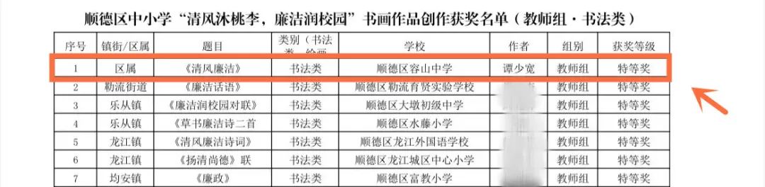 近日,順德區(qū)教育局公布了“清風沐桃李,廉潔潤校園”師生書畫作品創(chuàng)作活動獲獎名單,我校教師譚少寬的書法作品《清風廉潔》喜獲特等獎。另外,學生何紫盈的書法作品《蟬》也獲得了本次活動的二等獎。 獲獎名單