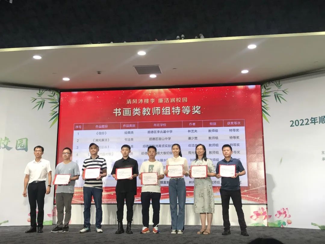 9月28日,順德區(qū)教育局在順德德勝學校舉辦“清風沐桃李,廉潔潤校園——2022年順德區(qū)廉潔文化進校園”活動成果展并舉行“廉潔文化進校園”系列活動頒獎儀式,我校校長區(qū)淑玲及獲獎教師譚少寬受邀出席活動。譚少寬老師的書法作品在本次活動中喜獲特等獎,現(xiàn)場接受了區(qū)教育局的頒獎。 區(qū)淑玲校長(右)與譚少寬老師(左)參與活動 譚少寬老師(右二)接受區(qū)教育局頒獎 師生獲獎證書 師生獲獎作品 譚少寬老師的書法作品《清風廉潔》 學生何紫盈的書法作品《蟬》
