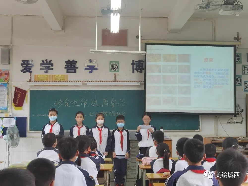 隨后由兩位小主持人帶領同學們認識什么是毒品以及毒品的種類有什么,再由每個小組的小組代表帶大家認識常見的毒品分別有哪些,同學們都聚精會神地學習。