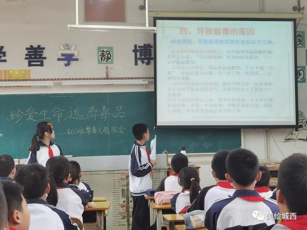 緊接著小主持人提出疑問,毒品的危害如此之大,為什么還會有青少年吸食毒品?帶著這個問題,同學們積極舉手發(fā)言,踴躍表達出自己的想法,大致總結出了四個導致吸毒的主要原因,讓同學們不對毒品抱有好奇心和僥幸心理。