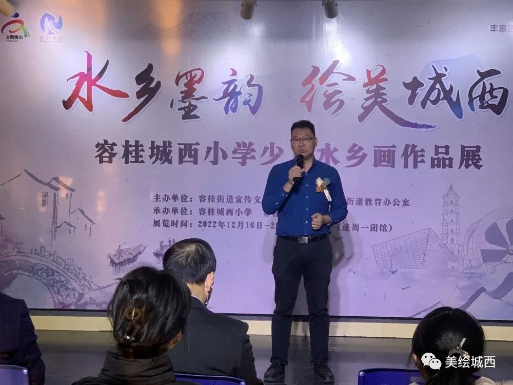 接著是容桂街道教育辦公室副總監(jiān)劉軍先生發(fā)言,他充分肯定了容桂城西小學(xué)美育成果,他認(rèn)為容桂城西小學(xué)“少兒水鄉(xiāng)畫”特色教育有效地傳承我區(qū)優(yōu)秀文化,在素質(zhì)教育實(shí)施方面探索出了一條成功的路徑,有效培養(yǎng)了學(xué)生的藝術(shù)修養(yǎng),促進(jìn)了學(xué)校的內(nèi)涵發(fā)展。他同時希然城西小學(xué)不要懈怠,要繼承和發(fā)展成果,為少兒水鄉(xiāng)畫特色校園的發(fā)展注入新的活力,進(jìn)一步打造城西小學(xué)少兒水鄉(xiāng)畫品牌。