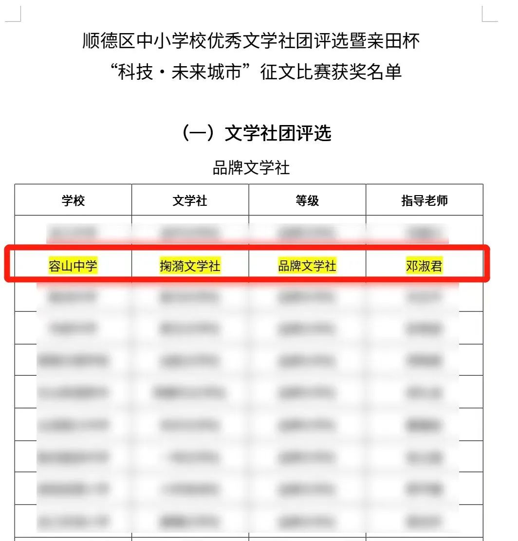 2022年11月順德區(qū)中小學(xué)校優(yōu)秀文學(xué)社團(tuán)評(píng)選暨親田杯“科技·未來城市”征文比賽活動(dòng)中,我校由鄧淑君、葉詩華老師指導(dǎo)的掬漪文學(xué)社以第二名的成績被評(píng)為“順德區(qū)品牌文學(xué)社團(tuán)”,習(xí)禮根老師指導(dǎo)的林煥勝同學(xué)征文榮獲二等獎(jiǎng)。