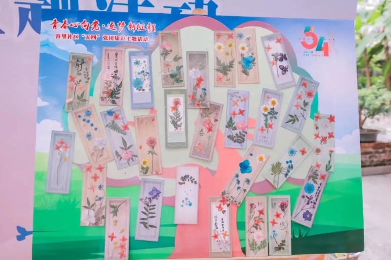 第四項:趣味手作。團員們聞著花香、精心構(gòu)圖,在空白書簽上擺放干花與樹葉進行造型設(shè)計和粘貼制作,并在書簽上寫下祝福語,大家相互交流,經(jīng)過創(chuàng)作,朵朵干花、片片綠葉在書簽上展現(xiàn)獨特風彩,“學(xué)習(xí)新思想、爭做新青年”、“把春日攬入懷中,點上青春的顏色”......