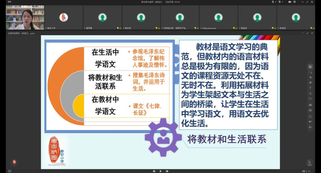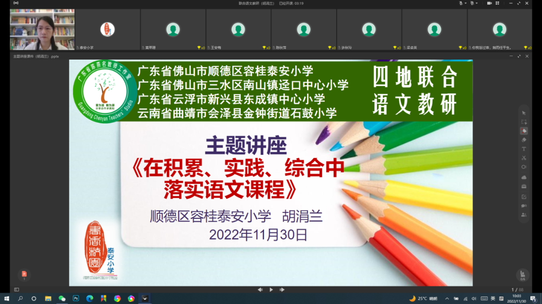 異地共同線上教研,區(qū)域間的教育扶貧,一直是國家的教育方針與教育舉措,能讓更多的人享受優(yōu)質(zhì)的教育資源。為促進(jìn)教學(xué)科研能力的提升,落實(shí)新課標(biāo)理念,加強(qiáng)順德、三水、云浮、云南四地的教學(xué)交流,11月30日上午,雖然已是寒天催日短,風(fēng)浪與云平的冬日時節(jié),佛山市順德區(qū)容桂泰安小學(xué)開展與云南省曲靖市會澤縣金鐘街道石鼓小學(xué)、云浮市新興縣東成鎮(zhèn)中心小學(xué)、佛山市三水區(qū)南山鎮(zhèn)涇口中心小學(xué)的四地聯(lián)合線上語文教研活動。 主持此次聯(lián)合教研活動的是佛山市優(yōu)秀學(xué)科青年教師胡涓蘭老師,為保障教研內(nèi)容的實(shí)用性、科學(xué)性、推廣性,胡涓蘭老師利用可視化技術(shù),為四地學(xué)校搭建了一個跨區(qū)域的交流研討平臺,進(jìn)行了既有理論高度,又有實(shí)操例證的主題講座《在積累、實(shí)踐、綜合中落實(shí)語文課程》。在兩個小時的講座和交流中,胡涓蘭老師結(jié)合了作文教學(xué)、閱讀教學(xué)以及在落實(shí)新課程理念中,需要提別注意語言的積累和梳理、語言的實(shí)用性和思辨性、整本書閱讀和跨學(xué)科學(xué)習(xí)、單元任務(wù)群組織與呈現(xiàn),穿插了學(xué)生辯證思維能力的提升、思維導(dǎo)圖工具的教學(xué)使用等。 先進(jìn)的教學(xué)理念及實(shí)踐操作經(jīng)驗(yàn)得到與會老師的高度評價,達(dá)到了區(qū)域聯(lián)合教研的目的。 他們紛紛表示:胡老師的講座“既有理論的高度”,又有“接地氣的實(shí)踐指導(dǎo)作用”,體現(xiàn)了胡老師扎實(shí)的專業(yè)素養(yǎng)及對教育的專注和熱情,體現(xiàn)了泰安小學(xué)濃厚的教育科研氛圍及專業(yè)引領(lǐng)作用。期待這種高效、實(shí)用的示范性聯(lián)合教研形式能得到更多的推廣和普及,使更多的教師在教育科研方面得到切實(shí)提升!