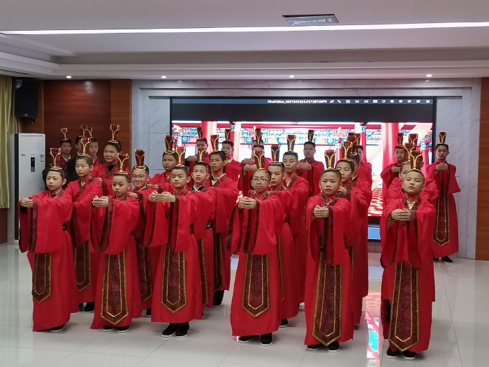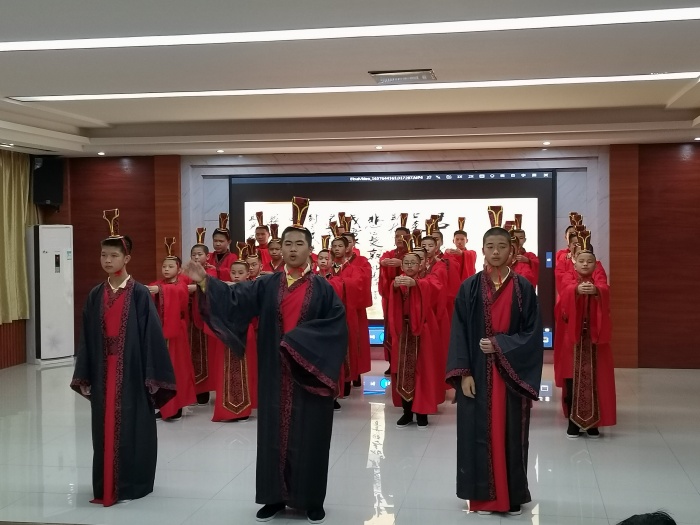 最后的華章是由整個(gè)七年級(jí)組合完成的。孩子們身穿漢服,躬行漢禮,以慷慨激昂的豪情誦讀了李白的《將進(jìn)酒》。小小的人兒,風(fēng)生水起,大唐的風(fēng)光,男兒的豪情都被同學(xué)們演繹得惟妙惟肖。