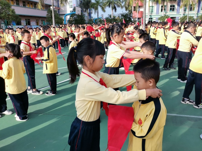 少先隊(duì)輔導(dǎo)員劉婷婷老師宣讀了新入隊(duì)少先隊(duì)員名單,并熱情歡迎新隊(duì)員的加入。伴隨著歡快的入隊(duì)曲,老隊(duì)員代表們給他們佩戴上了鮮艷而光榮的紅領(lǐng)巾,115名新隊(duì)員加入了光榮的中國(guó)少年先鋒隊(duì)。紅領(lǐng)巾寄托了革命前輩對(duì)偉大祖國(guó)的美好憧憬,紅領(lǐng)巾代表著少先隊(duì)員建設(shè)美麗中國(guó)的鄭重承諾。