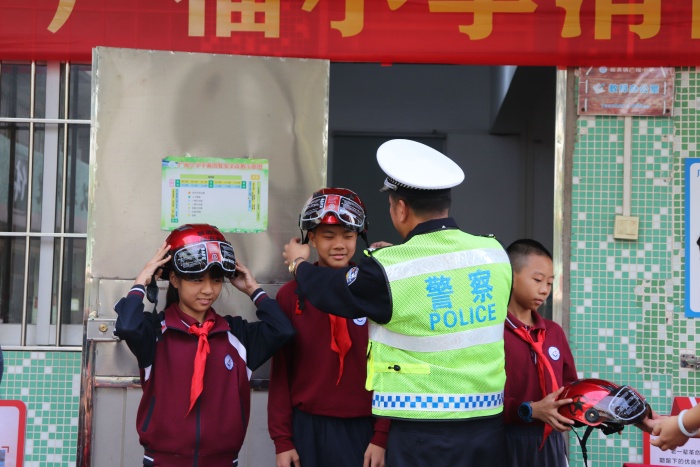陳寶華隊長結(jié)合自己多年的交警執(zhí)勤工作經(jīng)歷,通過各類交通事故案例總結(jié)造成交通事故的成因。陳隊長還現(xiàn)場支招,向同學們演示頭盔的正確佩戴方法,讓孩子們切實地體會“戴頭盔”的重要性。呼吁大家交通安全要時刻謹記“一盔一帶”,小手拉大手,攜手齊努力,保證乘車安全與有序。