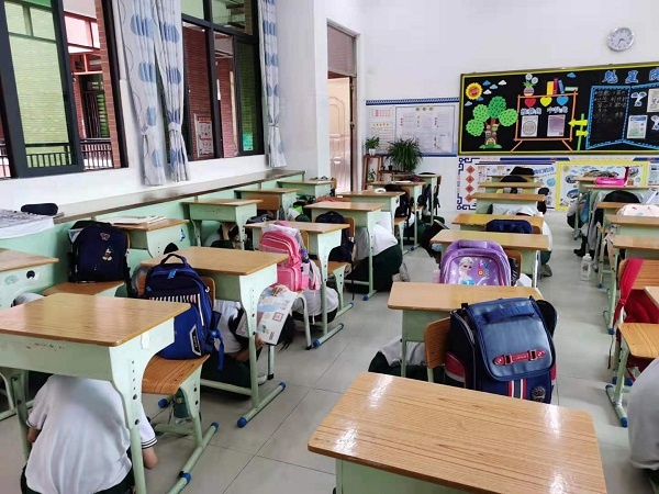 下午3:30分,演練正式開始,隨著第一次警報(bào)聲響起,各樓層管理員迅速到達(dá)指定位置,班主任立即組織教室內(nèi)學(xué)生抱頭,蜷曲身體躲避在課桌下,盡可能地保護(hù)頭部。
