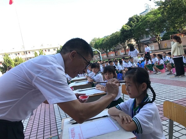 開筆禮第一環(huán)節(jié)是正衣冠,孩子們在低段語文科組長蔡老師的帶領(lǐng)下正衣冠,這是孩子們知書明理的第一步;隨后,在李杰華的帶領(lǐng)下,老師們?yōu)楹⒆觽冎焐皢⒅?,在他們的額頭中間點上朱砂印,祝福他們從此眼亮心明,啟迪智慧。第三環(huán)節(jié)由體育老師擊鼓明智,在三聲鼓聲中,孩子們跟隨謝老師明禮。第四環(huán)節(jié)由書法老師啟蒙描紅,李老師手握毛筆,飽蘸濃墨,在掛起的宣紙上教學(xué)生們一撇一捺寫下一個“人”字,寓意在人生的啟蒙階段學(xué)會做人是最為重要的。每班學(xué)生代表也在紙上認(rèn)認(rèn)真真地書寫“人”字并展示;最后一個環(huán)節(jié)是鞠躬敬師,全體老師上臺接受學(xué)生三鞠躬,接著向孔子畫像行“三拜禮”,表達(dá)尊敬敬師之情。