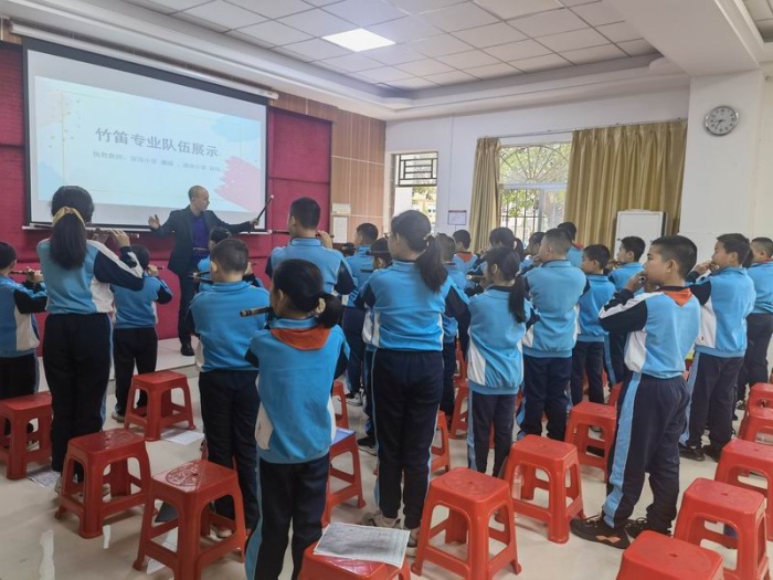 研討活動中,余超老師首先為全體音樂教師做《竹笛技巧練習》主題培訓,通過親自示范吹奏和講解相結(jié)合,指導大家進行氣息練習。隨后,課題組成員唐嶸老師和胡偉老師分別為深灣小學四五年級竹笛專業(yè)隊的同學上了兩節(jié)竹笛展示課,指導學生吹奏廣東音樂名曲《金蛇狂舞》和《大魚》,兩位老師耐心指導學生扎實練習竹笛基本功,由淺入深,層層遞進進行吹奏技巧的訓練,最后為大家吹奏出動聽的樂曲,學生的音樂素養(yǎng)有明顯的提高。