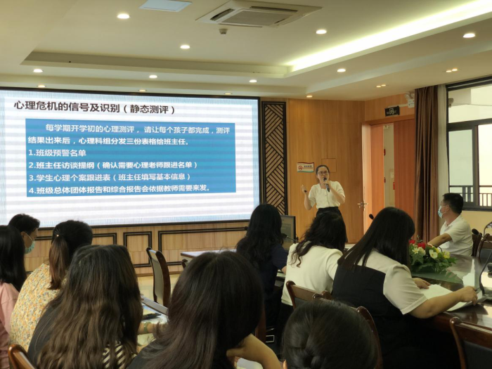 本次培訓(xùn)活動(dòng)主講為學(xué)校專職心理教師李晶晶老師。李老師從“心理危機(jī)信號(hào)識(shí)別、心理危機(jī)的預(yù)防預(yù)警以及心理危機(jī)干預(yù)”三個(gè)方面入手,為老師詳細(xì)講解在日常工作中如何識(shí)別學(xué)生心理危機(jī)的信號(hào);在讀取學(xué)生信號(hào)后,應(yīng)及時(shí)對(duì)學(xué)生進(jìn)行關(guān)懷與溝通,捕捉化解機(jī)遇;在遇到心理危機(jī)事件時(shí),要啟動(dòng)學(xué)校危機(jī)干預(yù)方案,聯(lián)合各方力量,進(jìn)行恰當(dāng)干預(yù),減少負(fù)性事件的不良影響。