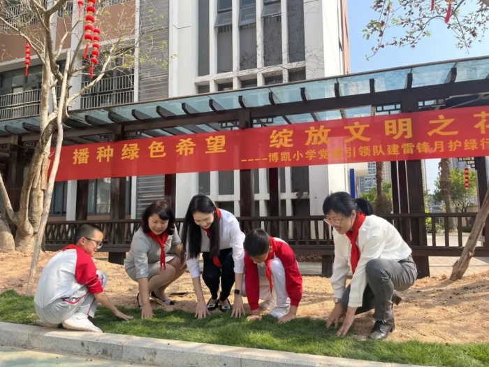 習(xí)近平爺爺說(shuō):“一樹新栽益四鄰。”和煦的春風(fēng)里,校園的行道樹悄然冒出點(diǎn)點(diǎn)嫩芽,枝頭上的鳥兒奏起了歡歌。為學(xué)習(xí)貫徹習(xí)近平總書記重要指示精神,進(jìn)一步傳承和弘揚(yáng)雷鋒精神,3月10日下午,博凱小學(xué)黨員教師帶領(lǐng)學(xué)校少先隊(duì)開展以“播種綠色希望,綻放文明之花”為主題的愛綠護(hù)綠學(xué)雷鋒志愿活動(dòng)。