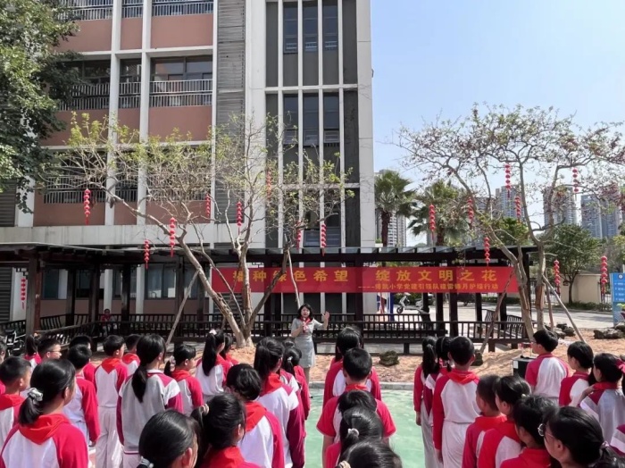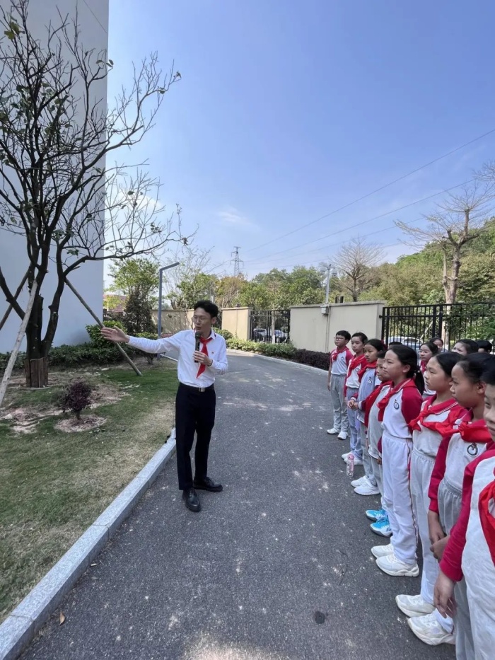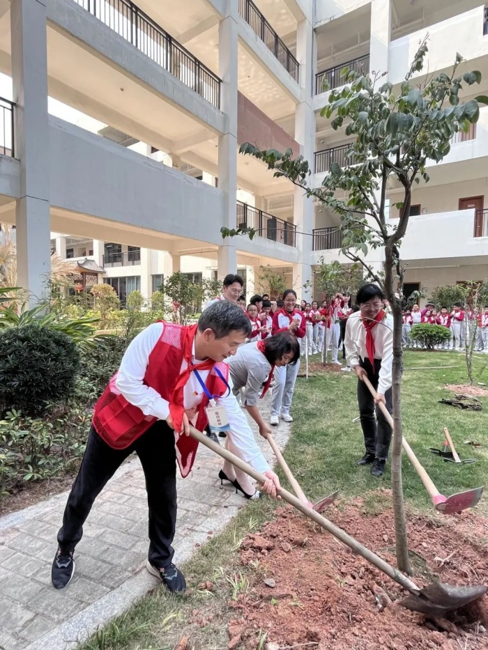 博凱小學(xué)校長(zhǎng)胡冬梅在活動(dòng)中致辭。胡校長(zhǎng)與隊(duì)員們探討交流:我們?yōu)槭裁匆矘??種植花草樹木后我們要如何做?我們種下的花草樹木它們身上有哪些品質(zhì)值得我們學(xué)習(xí)?胡校長(zhǎng)希望同學(xué)們學(xué)習(xí)“野火燒不盡,春風(fēng)吹又生”般堅(jiān)韌不屈的精神。她娓娓講述了身后那棵年初時(shí)新栽下的樹的故事,那是一棵曾被雷電劈中傷痕累累的樹,就在護(hù)林員以為它挺不過那年冬天時(shí),它頑強(qiáng)地冒出了新芽,不拋棄不放棄。挑選移栽樹木時(shí),這棵經(jīng)歷艱難困苦終卻重?zé)ㄐ律臉淞钊苏鄯?,于是它?lái)到了博凱校園,在這個(gè)書聲瑯瑯的春日里生發(fā)出點(diǎn)點(diǎn)綠芽,與博凱學(xué)子一起向陽(yáng)生長(zhǎng)。