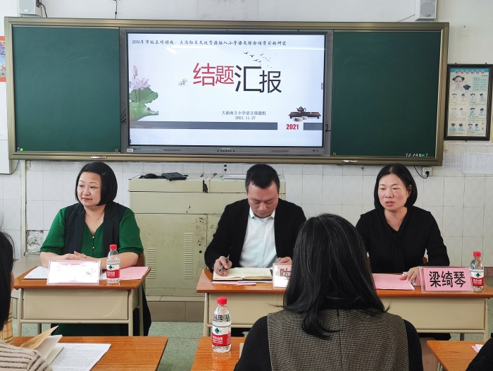 11月27日上午,大涌南文小學的市級立項課題《大涌紅木文化資源融入小學語文綜合性學習研究》歷經(jīng)四年多的研究與實踐,終于迎來了結題鑒定會。市教研室語文教研員梁雪菊老師、火炬開發(fā)區(qū)中心小學萬小兵副校長、大涌鎮(zhèn)旗南小學梁琦琴校長、大涌鎮(zhèn)教育事務指導中心教研員陳文惠老師蒞臨指導課題驗收工作。大涌南文小學羅門光校長、林君韶副校長及課題組成員和語文科組的老師們共聚六3班參加了結題鑒定會,會議由教導主任盧煥英主持。