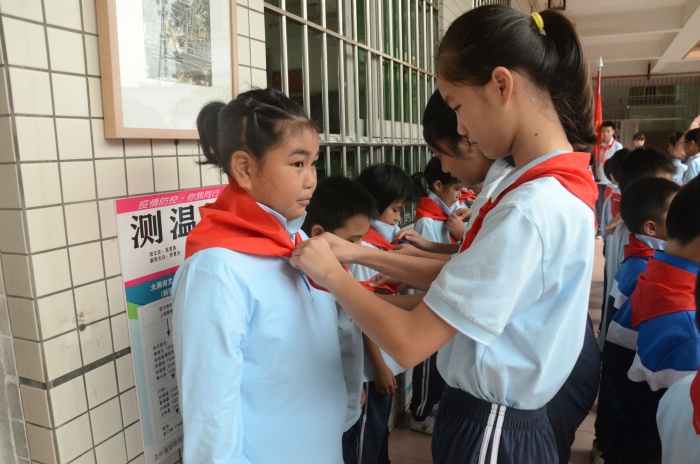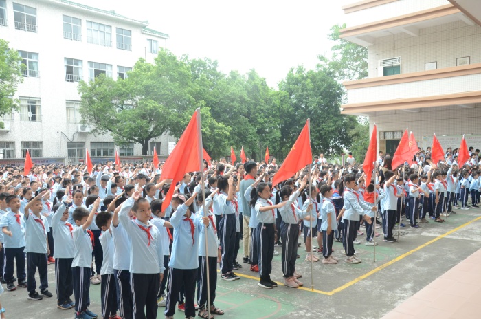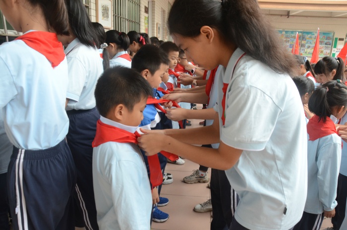 入隊(duì)儀式隨著《中國少年先鋒隊(duì)隊(duì)歌》的歌聲正式拉開序幕,少先隊(duì)輔導(dǎo)員王利勇老師宣布了入隊(duì)決定。通過分批入隊(duì),本次又有130名新隊(duì)員光榮的加入了少先隊(duì)組織,這是他們光榮和幸福的時(shí)刻!決定宣布之后,六年級優(yōu)秀少先隊(duì)員代表為新少先隊(duì)隊(duì)員佩戴了鮮艷的紅領(lǐng)巾,此刻在鮮艷的隊(duì)旗下,全體少先隊(duì)員們的莊嚴(yán)宣誓響徹大涌南文小學(xué)校園的上空。在大隊(duì)輔導(dǎo)員的帶領(lǐng)下,少先隊(duì)員們大聲呼號:“時(shí)刻準(zhǔn)備著”,表明為共產(chǎn)主義事業(yè)貢獻(xiàn)力量的決心。