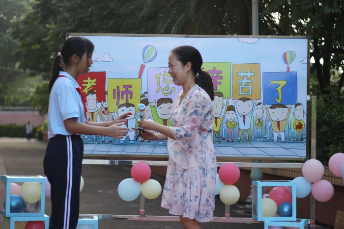 在操場上,旗北小學(xué)兩位學(xué)生為全體教師送出深情的詩朗誦,贊美廣大教師的一路辛勤耕耘,靜能春風(fēng)化雨潤物無聲,動能點石成金琢璞成器。隨后,在這幸福、溫馨的時刻,少先隊監(jiān)督崗隊員代表旗北學(xué)子,為教師們送上節(jié)日的禮物和祝福。一聲聲“老師,您辛苦了”的感恩之語在旗北校園傳遞,在旗北教師心間回暖。