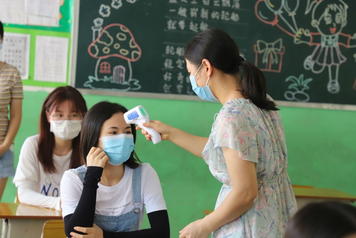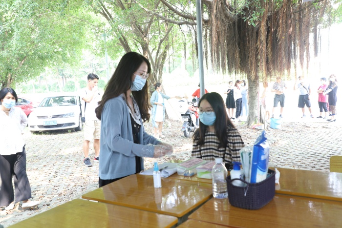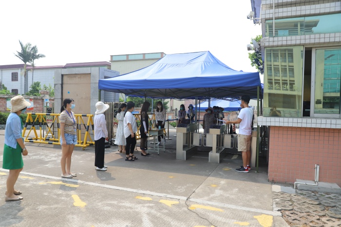 課室是學(xué)生上課的主要密集場所,課室演練必不可少。在課室上課演練過程中,上課老師發(fā)現(xiàn)有一個學(xué)生舉手報告自己不舒服。上課老師及時給學(xué)生測量體溫并把學(xué)生帶到走廊等候聯(lián)系班主任,班主任把學(xué)生帶到校醫(yī)室進行下一步的檢測。同時,上課老師通過疏散通道把班上其他同學(xué)帶到備用課室,進行體溫檢測,通知學(xué)校防疫工作小組領(lǐng)導(dǎo)進一步做好登記和通知后勤人員全面消毒。