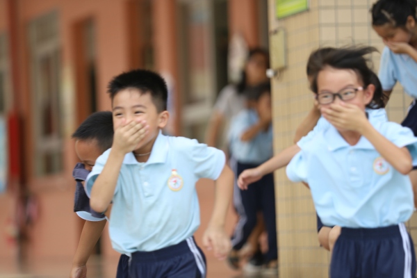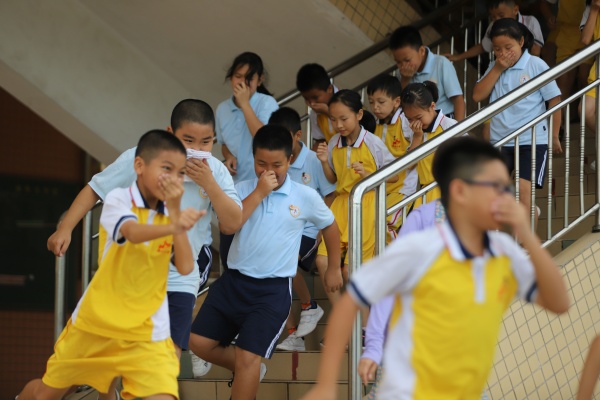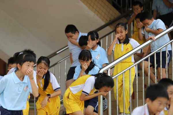演練開始前,少先隊(duì)輔導(dǎo)員林嘉誠老師對(duì)全校師生進(jìn)行了安全教育,指出在疏散演練中要注意安全事項(xiàng)和和逃生的方法。隨著警報(bào)聲響起,全校950多名學(xué)生在各班老師的指引下,弓著腰,用手、袖口、濕毛巾等捂著嘴鼻迅速有序地進(jìn)行應(yīng)急疏散,全體師生快而有序地撤離到校園安全地帶。從警報(bào)聲響起到最后一名學(xué)生撤離到廣場,用時(shí)3分多。學(xué)生安全撤離到廣場后,各班迅速清點(diǎn)人數(shù),確保每一名學(xué)生都已安全撤離,并及時(shí)將清點(diǎn)結(jié)果匯報(bào)給演練總指揮李文科老師。
