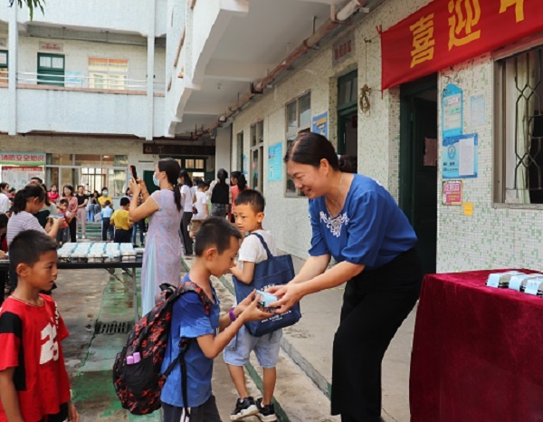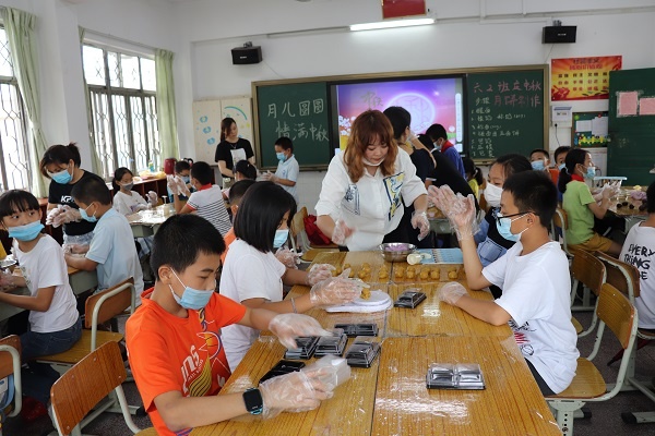 下午四點,全體師生歡聚校園,梁綺琴校長和孫林強主任為全體學生分發(fā)了月餅并送上深深的祝福。