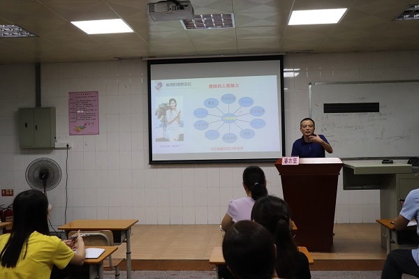 會(huì)議上,潘志堅(jiān)主任為全體教師作《你若精彩,蝶舞自來——新時(shí)代教師的師德與幸?!穼n}講座,潘主任從教師的現(xiàn)實(shí)寫照、教師的理想定位、教師的職業(yè)操守、教師的自覺追求,四個(gè)方面侃侃而談,對(duì)新時(shí)代教師的師德與幸福進(jìn)行了深入解讀。隨后,潘主任還以一組“年輕教師忙碌的一天”漫畫呈現(xiàn)當(dāng)前中小學(xué)教師的現(xiàn)實(shí)寫照,啟發(fā)老師們思考:我們每天從事的教育教學(xué)工作的本質(zhì)是什么?什么是教育?教師做什么?潘主任鼓勵(lì)教師們要學(xué)會(huì)微笑、學(xué)會(huì)表達(dá)、學(xué)會(huì)親近、學(xué)會(huì)傾聽、學(xué)會(huì)溝通、學(xué)會(huì)感受、學(xué)會(huì)發(fā)現(xiàn),努力修煉教師的人格魅力,做一個(gè)具有堅(jiān)定的政治方向、高尚的個(gè)人品德、穩(wěn)定的心理品質(zhì)、良好的行為習(xí)慣、向上的社交能力、高雅的審美情趣的魅力型教師。