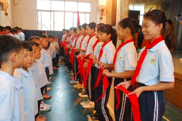 校園里樂聲嘹亮,隊旗飄揚。嵐田小學大隊輔導員伍永浩老師宣讀新隊員名單,宣布二年級的80名學生被正式批準加入中國少年先鋒隊?,F(xiàn)場響起熱烈的掌聲,祝賀新隊員們光榮加入少先隊組織,成為少先隊組織的一員。隨后,高年級的少先隊員為新隊員們佩戴紅領(lǐng)巾,并互敬隊禮。當鮮艷的紅領(lǐng)巾佩戴在胸前時,新隊員的臉上都洋溢著激動與自豪。